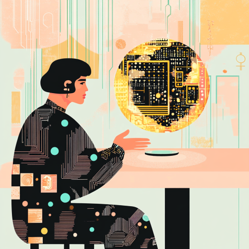An atomic midmodern art style illustration of a futuristic fortune teller sitting at a retro-modern table, gazing into a glowing crystal ball made of swirling blockchain code and cryptocurrency symbols. The fortune teller wears sleek, minimalist clothing with geometric patterns, and the scene has a bold, vibrant color palette typical of mid-century design. The background features clean lines and abstract shapes in soft pastels, with subtle metallic elements, blending vintage aesthetics with digital futurism. The crystal ball glows, illuminating the teller’s face with intricate blockchain patterns.
