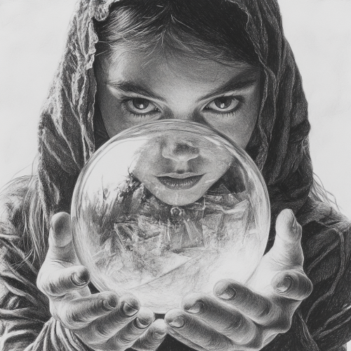 crystal ball, a young girl fortune teller with a crystal ball full of images of future, surreal style, pencil drawing, mysterious dark mood, strong contrast