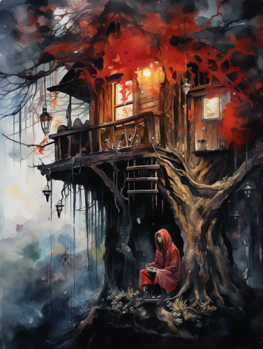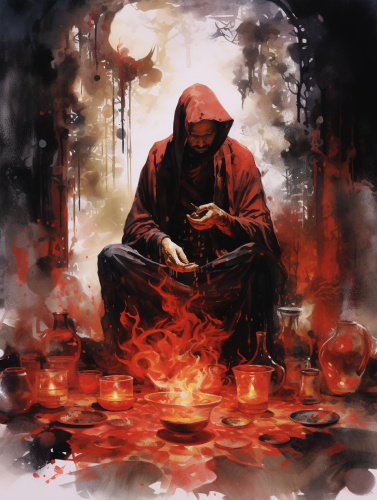 dark colors, red, fay man in dark clothes, he is a fortune teller, misty, dark, incense, oracle, fantasy, watercolor style, loose gestural, --ar 27:36