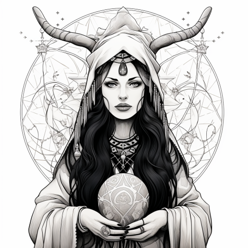 fortune teller woman, with deer horns, line art, coloring book, black and white