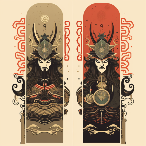 Two images of ancient Chinese samurai door gods, totem art graphic illustrations, retro poster design, stone carving patterns, black color scheme, Sharp illustrations, flat style, white background