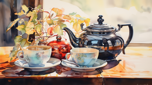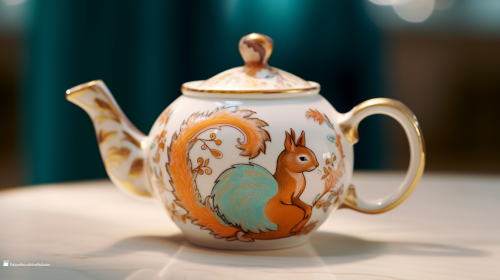 Intricate squirrel design on a fine china tea pot, vivid colors and delicate details. High-resolution shot with a Canon EOS R5, highlighting the artistry and elegance against a soft, neutral background. 8k. --ar 16:9 --v 5.1 --style raw --s 750