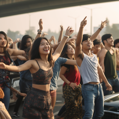 asians partying on a freeway in a traffic jam, summertime, day, dancing --v 5.0