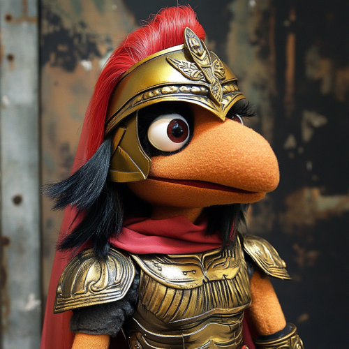 Realistic photo pf A sesame street, muppet style basic puppet of of Lady Sparta, darker greek skin Wonder Woman style human female hero themed around Spartan Armor, primarily red and gold, spartan helmet with crest, The puppet should maintain a similar whimsical and playful look, with distinct details unique to the character's theme,