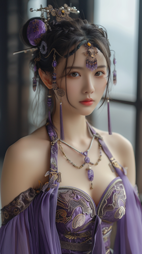 A beautiful Chinese Woman cosplay league of legend Kai’Sa, purple mood, wearing purple tize --s 500 --v 6.0 --ar 9:16