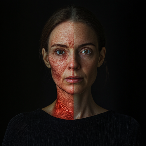 A European woman resembling a influencer, with contrasting facial features: the left side of her face shows the wrinkles and texture of a woman in her 40s, while the right side appears youthful and clear with smooth, radiant skin like that of a woman in her 20s. Subtle red veins glow beneath the skin, especially visible on the youthful side, adding an ethereal, slightly surreal effect. Background is pitch black, enhancing the contrast and focusing on the transformation. Ultra-realistic skin textures, dramatic lighting, and high contrast between aged and youthful features.