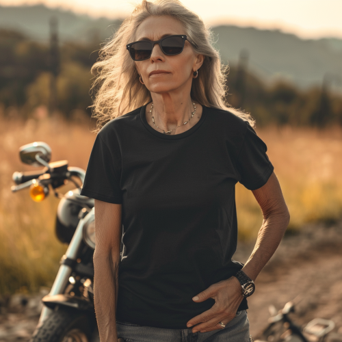 a full black blank t shirt mockup, an old biker lady is wearing this full black blank t shirt, Harley davidson in background, hyper realistic, sunny background