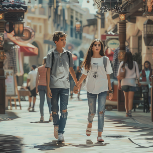 photorealistic scenerie in Dubai with two students in the center of the picture, a boy and a girl, looking good, slightly like models and confident. They walk side by side and look into the camera. the scenerie should be sunny, in a thriving city with people walking around. show the two students in medium shot. ar 9:16