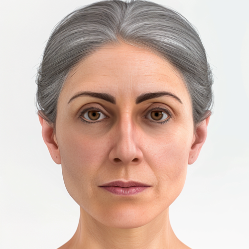 An ultra-realistic depiction of a mature woman's face, beautifully blending signs of aging with youthful vitality. Her skin appears smooth and firm, suggesting a younger age. Plain white background to accentuate her features. Created Using --v 6.0
