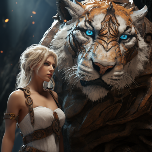 big fantasy tiger with stone elements standing by climbing girl HD 8K