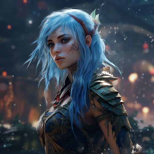 Generate an image that depicts a female elf warrior with blue hair in a Final Fantasy concept art style. ::