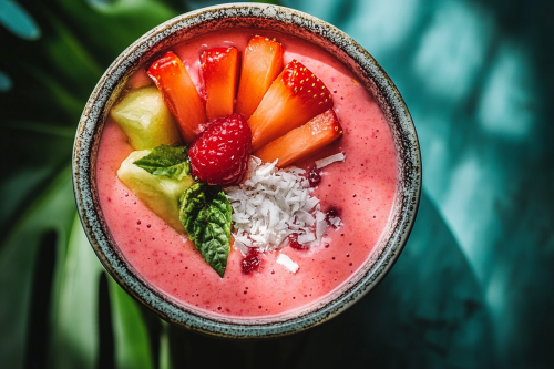 STYLE: Close-up Shot Top view | EMOTION: Tempting I SCENE: Tropical Smoothie Bowl| TAGS: High-end food photography, clean composition, dramatic lighting, luxurious, elegant, mouth-watering, indulgent, gourmet | CAMERA: Nikon Z7 | FOCAL LENGTH: 50mm | SHOT TYPE: Close-up | COMPOSITION: Top view Centered | LIGHTING: Soft directional light | PRODUCTION: Food Stylist --ar 3:2