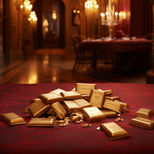 "A simple, elegant box of gourmet chocolates, containing 12 neatly arranged chocolates. The box has a minimalistic, luxurious design with subtle gold accents, and its lid is placed to the side, clearly displaying the brand's logo in an elegant font. The box is set on an intricately decorated table, featuring a white linen tablecloth, delicate floral centerpieces, and golden cutlery. Soft, warm lighting enhances the luxurious atmosphere. In the background, a beautiful wedding event unfolds, with fairy lights hanging from trees, and guests seated at tables decorated with flowers and candles. The focus remains on the chocolate box and its logo, but the elegant wedding scene adds depth and richness to the composition, creating a sophisticated and high-end aesthetic suitable for a wedding magazine cover."