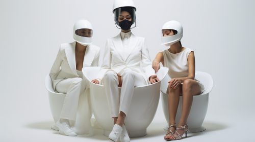 3 shot, a beautiful asian female sitting in a chair in a all white studio, she is happy, two people dressed in high fashion white clothes wearing face masks pour a bucket of chocolate on top of the woman sitting in the chair, high fashion, editorial, high contrast lighting, unique composition, cinematic, focal length 16mm, f/2, detailed, realistic, Ben Hassett style, color palette of white, chocolate, gold --ar 16:9