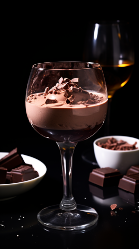 STYLE: Close-up Shot Top view | EMOTION: Tempting I SCENE: French dessert Chocolate Mousse A close-up photo of rich, creamy chocolate mousse in small glass bowls with layers and texture, topped with dark chocolate shavings viewed from the side, and garnished with whipped cream on top. The background is a white marble table with blue napkins beside it. | TAGS: High-end food photography, clean composition, dramatic lighting, luxurious, elegant, mouth-watering, indulgent, gourmet | CAMERA: Nikon Z7 | FOCAL LENGTH: 50mm | SHOT TYPE: Close-up | COMPOSITION: Top view Centered | LIGHTING: Soft directional light | PRODUCTION: Food Stylist --ar 3:2