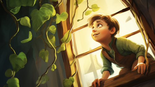 Jack looked out of the window. There was a giant beanstalk. He went outside and started to climb the beanstalk --ar 16:9