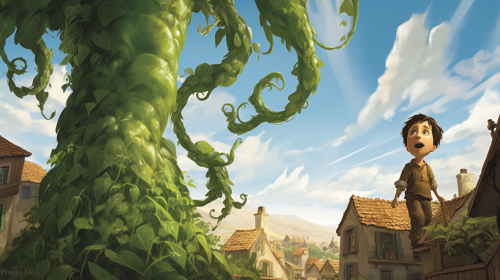 Jack in a village . There was a giant long beanstalk looking forward to sky. He started to climb the beanstalk --ar 16:9