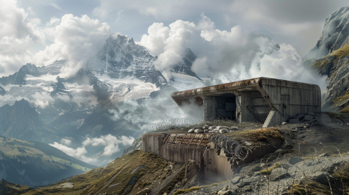 A hyper-realistic photograph of a rugged Swiss mountain landscape during wartime, featuring a hidden military bunker camouflaged within the rocky terrain, near iconic Alpine peaks. The bunker is weathered, with chipped concrete and a steel door, faint traces of conflict on surrounding rocks