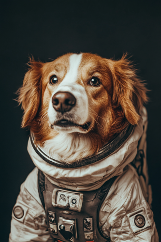 image d'un chien habillé en cosmonaute:: 5 artistic photography:: 4 creative, expressive, unique, high-quality, canon EOS 5D Mark IV DSLR, f/5-6 aperture, 1/125 second shutter speed, ISO 100, Adobe photoshop, award wining, gilbatree style, experimental techniques, unusual perspective, attention K detail:: 3 blunny, dim, uninspred::-2 --ar 2:3