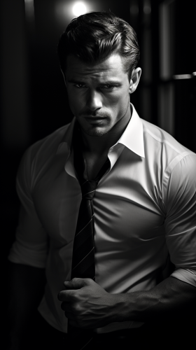 bruce wayne as christian grey, moody portrait in the living room, soft light, shadows covering face, black and white --ar 9:16