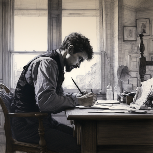 A handsome bald man with brown beard sitting at a rustic desk writing. Norman Rockwell 1920s saturday evening post cover.