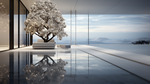 ethereal fantasy. Christmas tree. Christmas spirit. Modern minimalist swimming pool. Clean lines. Christmas. Black and white subtle elegant color splash. Stylish. High-end. Important. Mysterious. Shot with a Pentax. K-3 III Monochrome. Extreme low angle shot. Shooting straight up. --ar 16:9 --q 0.5 --s 750