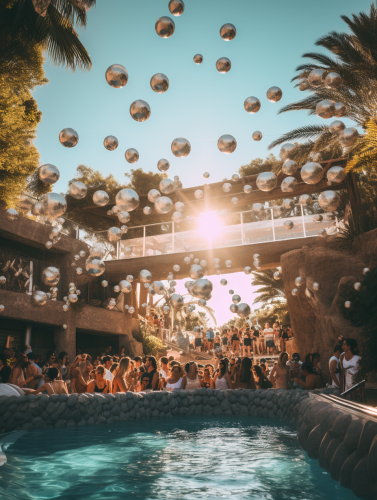 photo of a ibiza pool party with dancing people, the pool is surrounded by christmas trees, summertime --ar 3:4