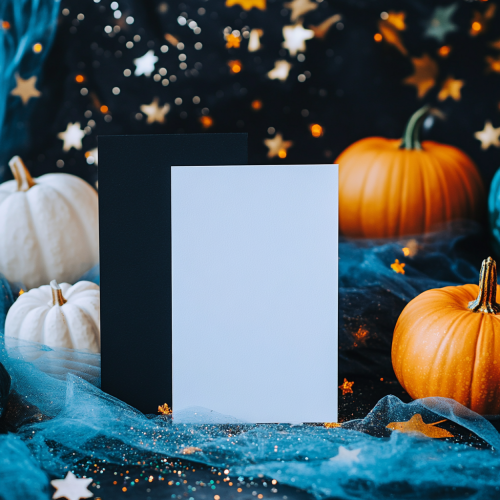 design an artful invitation card for a doctor's christmas party in the style of a rorschach test using also typical christmas symbols, using just the colours capriblue yellow magenta on a white background --ar 3:2