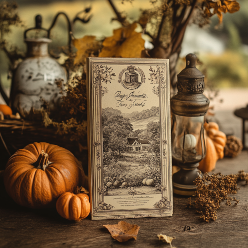 A countryside-inspired invitation design for a harvest fair in a southern town named Harveston, with a style from the 1890s to 1900s and inspired by Over the Garden Wall. The design is vintage and nostalgic, with ornate Victorian typography, illustrations of pumpkins, lanterns, and misty woods. The background is warm and earthy, featuring detailed engravings of barns, hay bales, and autumn trees. The color palette includes muted oranges, browns, and golds, with a soft, antique feel, and the invitation text highlights southern belles and hardworking gentlemen. Daylight. --q 0.5 --s 250 --v 6.1