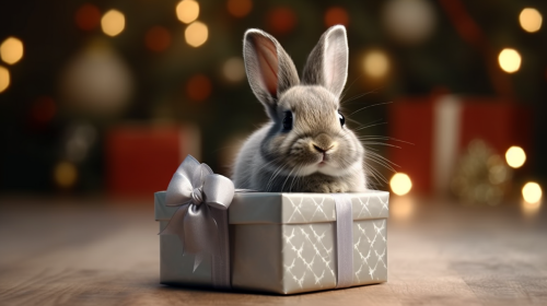 Cozy Family under Christmas Tree, realistic, with gift box, background with diffuse light spots, --ar 2:1