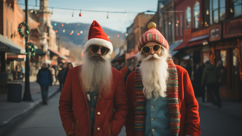 Eccentric and Quirky characters dressed in Christmas attire exploring the sights of downtown New York City. Meticulously arranged minimalist symmetrical festive backdrop. Snow. White and red fuzzy Santa hats. Red and green festive attire. Holiday scenery. Vintage feel. Retro feel. Extreme blue skies. Presented in geometric art style. Extreme low angle camera shot. Looking straight up. High-end. Stylish. Black and white with color splash. Clean lines. Shot with a Pentax. K-3 III Monochrome. --ar 16:9 --q 0.5 --s 750