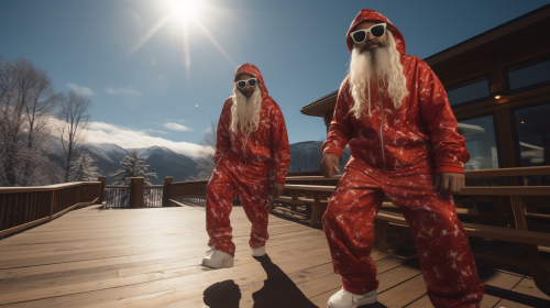 Christmas in a mountain resort in Asheville North Carolina. Snow covered mountains. Extreme blue skies. Worm’s eye view camera angle. Ground level view. Bakeh elements. Blurred blackground. Playful scenes with eccentric and quirky characters dressed in Christmas attire defying conventional logic and reality, creating a sense of whimsy within a minimalistic symmetrical composition. High-end. Stylish. Black and white with color splash. Clean lines. Shot with a Pentax. K-3 III Monochrome. --ar 16:9 --q 0.5 --s 750
