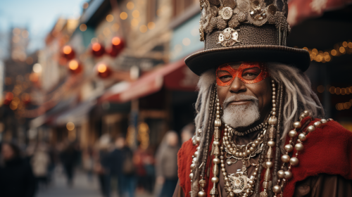 Christmas in the mountains of Asheville North Carolina. Extreme low angle camera shot. Looking straight up, Eccentric and Quirky characters dressed in Christmas attire immersed in Intricate holiday details and vibrant, stylized compositions creating a visually captivating minimalist symmetrical scene. High-end. Stylish. Black and white with color splash. Clean lines. Shot with a Pentax. K-3 III Monochrome. --ar 16:9 --q 0.5 --s 750