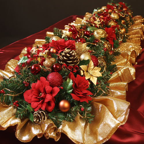 A beautifully set table with a red tablecloth and golden cutlery, surrounded by twinkling candles. Add light reflections on crystal glasses and create a festive background with garlands and hanging decorations, enhancing the celebratory vibe. --ar 16:9