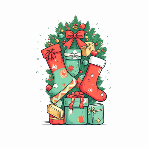 christmas sock packed with gifts, cute japanese illustration style, simple line, white background