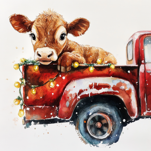 a baby jersey cow in the back of a 1950s red truck. The cow has large eyes. Cute. Side view. The truck has Christmas lights on it. Christmas feel. Hand painted. Watercolor. Flat white background.
