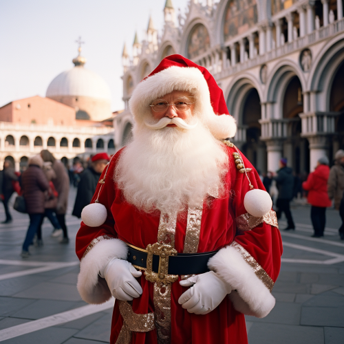Create a glittering day at Christmas in Venice, with Christmas lights decorating the streets of St. Mark's Square. In the center of the square, you can see many athletic and charming Santas. They wear elegant red suits with sparkling belts. Their smiling faces are surrounded by perfectly groomed white beards and they have a lively look in their eyes. They run energetically along the square, spreading Christmas joy as they exchange smiles and greetings with the crowd. Next to them are beautiful Italian Befane, dressed in splendid typical Italian befana outfits. The Hags have an elegance and grace that capture everyone's attention as they join the Christmas rush. Their faces are radiant with happiness, and they carry Christmas stockings filled with sweets and gifts to distribute to children. This scene embodies the Christmas spirit of celebration and joy, with charming Santas and Befane bringing the warmth and magic of Christmas to St. Mark's Square in Venice--4K