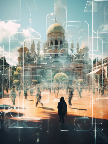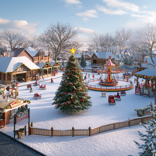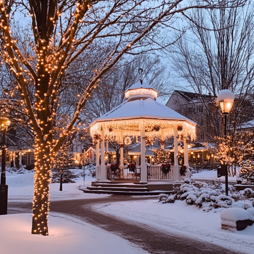 a snow laden town square hosting a christmas festival with lively decorations and twinkling lights everywhere. In the center of the square is a white gazebo covered in lights, Christmas, Winter, Hallmark Christmas Movie vibes