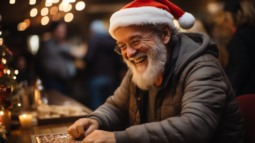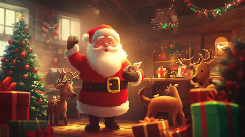 charming illustration of Santa's workshop, with reindeer happily preparing Christmas presents under Santa's warm gaze. It captures the joyful holiday spirit. --ar 16:9