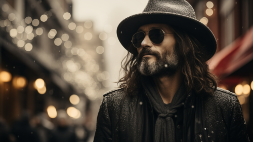 and white photo with dramatic color splash. Eccentric and quirky adults are meticulously posed and positioned in a Christmas village in Asheville North Carolina. Very stylish. Very festive. Lots of Christmas trees. Minimalist symmetrical setting. Vibrant hues. Tapestry of whimsy. nostalgia with a dash of quirky charm. Shot with a Pentax. K - 3 III Monochrome . Santa hats. Christmas tree in background. Presented in 1970’s British modernist pop art style. Blurred background. Bakeh elements. High - end. Very Stylish. --ar 16:9 --q 0.5 --s 750