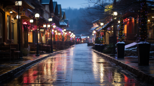 Christmas lights downtown in a mountain village in western North Carolina. Cubist. Christmas decorations on street. Christmas deviations in stores. Hallmark style. Better homes and gardens style. Black and white with vibrant color splash. White Christmas lights. . Blue-green water. White sand. Golden hour. Stylish. High - end. Important. Mysterious. Shot with a Pentax. K - 3 III Monochrome. --ar 16:9 --q 0.5 --s 750