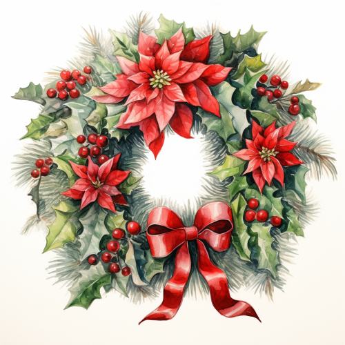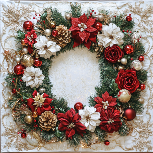 Create a beautiful Christmas Season rectangular fabric design that has wreath in the center is a very thick wreath made of noble pine tips that hoe up to the edge of the fabric. Embellish with a lot of red and green and gold baubles and a lot of red and white roses and glittered pine cones and red cardinals and a lot of iridescent white snowflakes and glittered stars. Wide red red satin bows and lots of coils of brass wire and a lot of white and red mini Christmas lights. The center and background is white iridescent sparkle fabric. The edges around the rectangle design is thick gold ruffles. --v 6.1