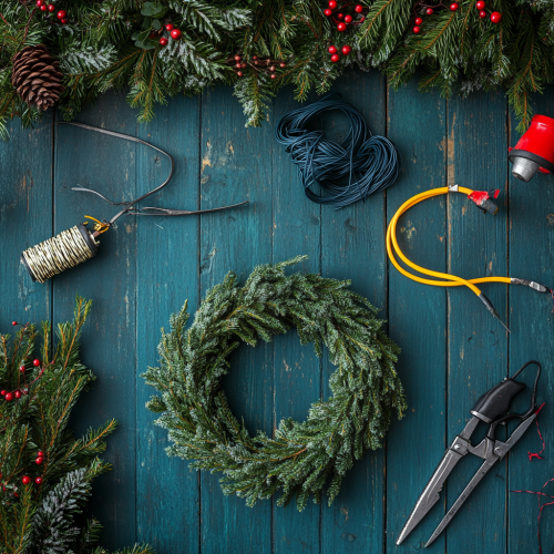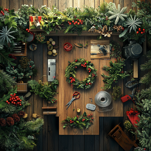 a background an aerial view of a shed florists work bench featuring fir sprigs, holly, secateurs and a reel of wire. Cosy Christmas wreath making workbench. Photorealistic and magical