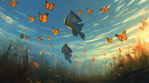 [595a1d447] A group of jellyfish and butterflies are dancing in the sky, with a blue-orange color scheme, realistic and cinematic, reminiscent of director Christopher Nolan's style. --no 不要人 --v 5.2 --ar 16:9 --c 0
