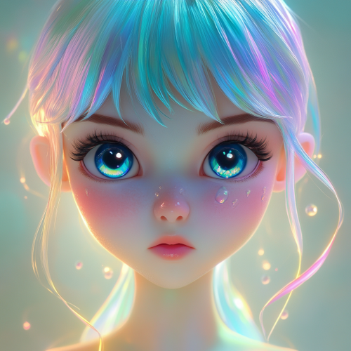 Create a 3D animated character portrait with large, glossy eyes and smooth, semi-translucent, blurred skin. The character should have a soft, ethereal glow, as if lit from within. Their expression should evoke a melancholic yet whimsical mood, with subtle features like teardrops or misty eyes. The colors should be soft and pastel, with gradient hair blending vibrant yet soft tones like blue, pink, or green. Incorporate elements of surrealism, such as dreamlike lighting and exaggerated proportions, giving the character a floating or otherworldly appearance. The overall style should be polished, surreal, and emotive, with a soft blur over the skin to enhance the ethereal, dreamlike atmosphere.
