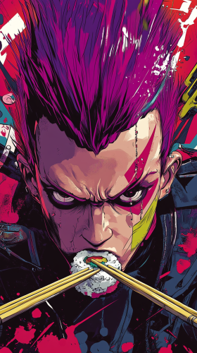 Fighting and attacking with chopsticks TRANSFORMERS portrait with sushi rolls and otaku vector Akira Toriyama style with Purple mohawk punk hair downtown tokyo 3D chrome --ar 9:16