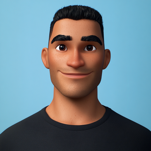 portrait of a man slightly smiling, slightly tanned, 3d render, 3d model blender, pixar style, hyperrealism, 4k, black t-shirt, short buzzcut straight black hair on blank blue background