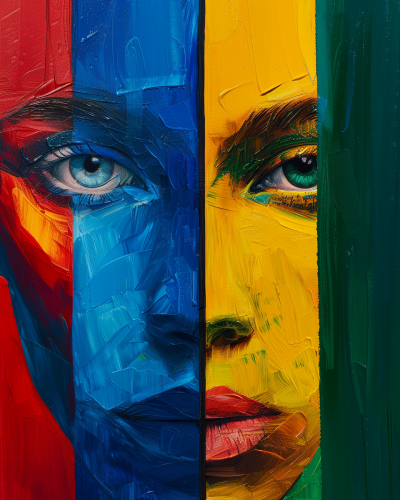 Four verticaly Sections close-up Portrait of single face Divided by Invisible Lines, from Left to Right Blue Green Red and Yellow Colors --v 6.0 --ar 4:5
