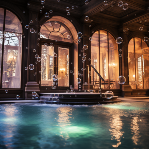Late 1980s decor style magazine. Mansion indoor pool. Powder blue and luxurious white. Miami at night. Vibrant and blue lighting. Tropical house plants. Dynamic atmosphere. 80s camera filter --ar 4:5