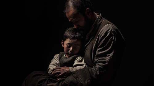 a Chubby German male of 19th century, sitting on the A young Japanese poverty man's lap of 19th century, in the dark, solid black background, perfect side angle, 8k --ar 16:9